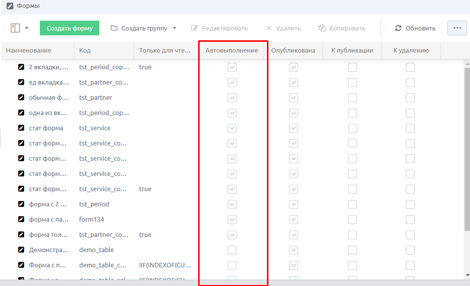 В реестрах форм можно отобразить дополнительный столбец “Автовыполнение”, который показывает текущее состояние флага “Автовыполнение при изменении значений параметров” для каждой формы.