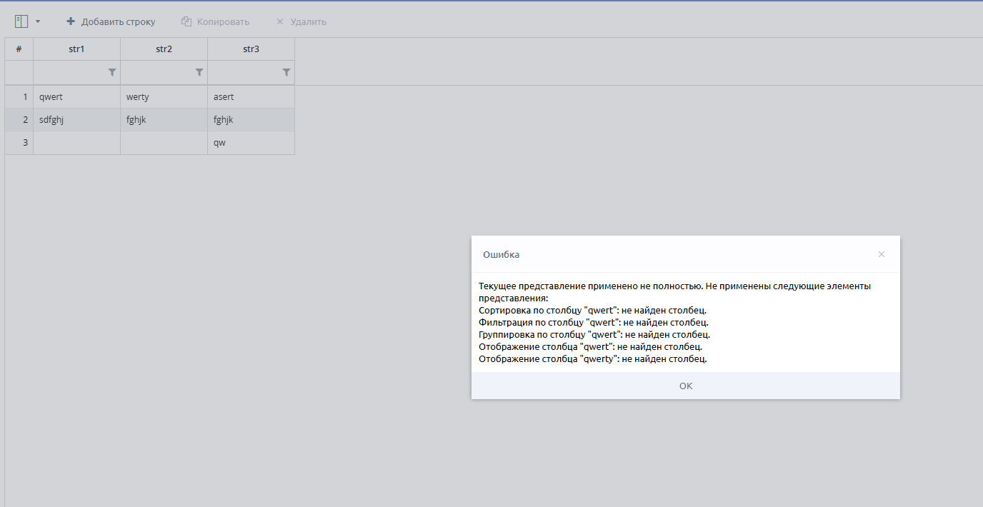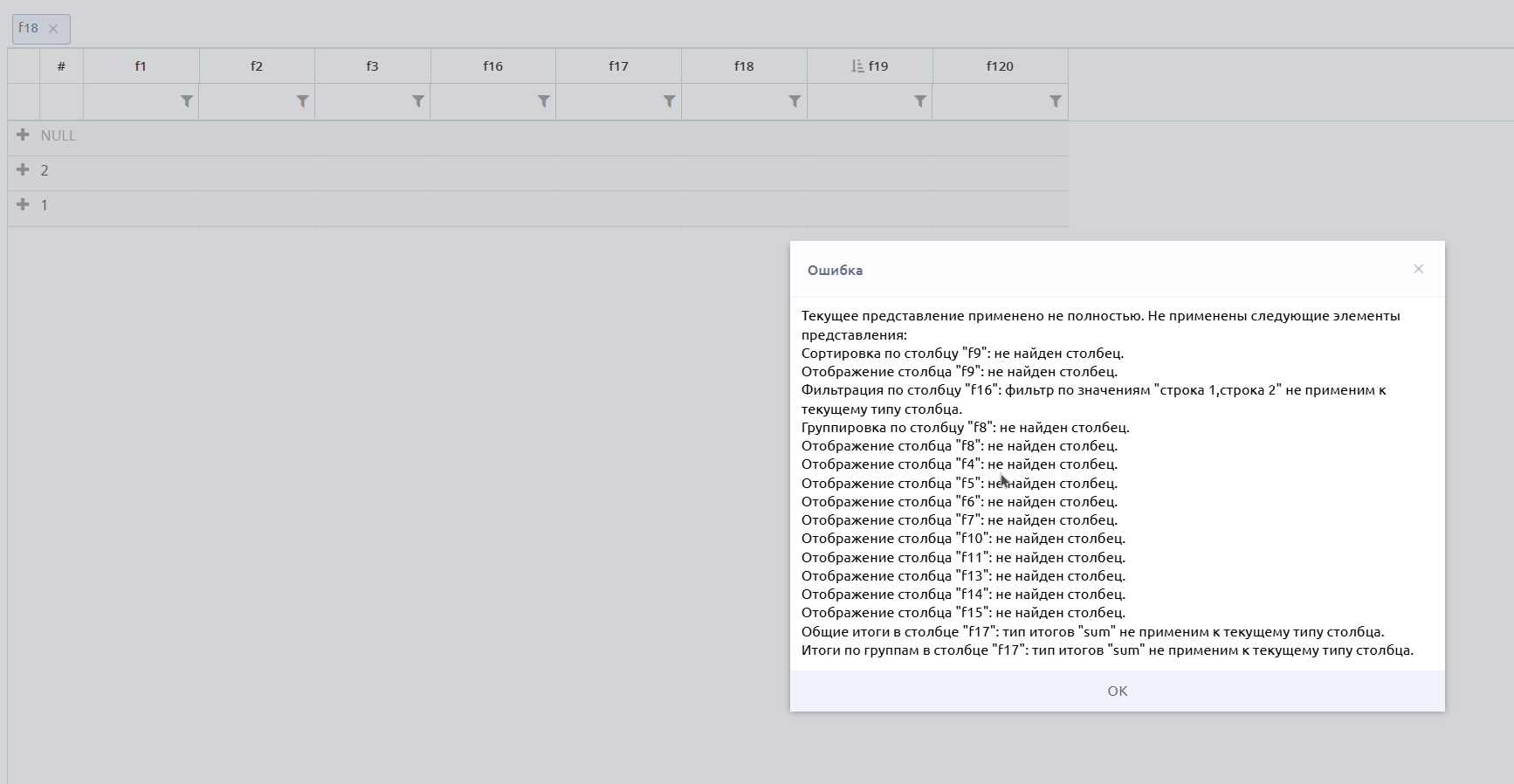 | Изменение типа поля | Формы | Примененная фильтрация по полю | Фильтрация по столбцу “code”: фильтр по значениям “строка 1,строка 2” не применим к текущему типу столбца. |